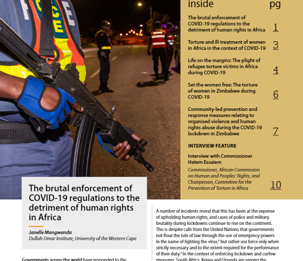 This special bulletin on reparation for victims of torture in Africa focuses on the effects of COVID-19, including the enforcement of pandemic regulations to the detriment of human rights, torture and ill-treatment of women, the plight of refugee torture victims, and community-led prevention and response measures relating to organised violence and human rights abuses during the lockdown in Zimbabwe, among other topics.