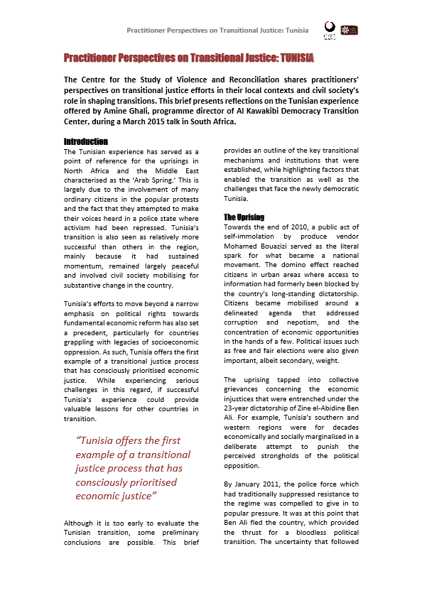 CSVR shares practitioners' perspectives on transitional justice efforts in their local contexts and civil society's role in shaping transitions. This brief presents reflections on the Tunisian experience offered by Amine Ghali, programme director of Al Kawakibi Democracy Transition Center, during a March 2015 talk in South Africa.