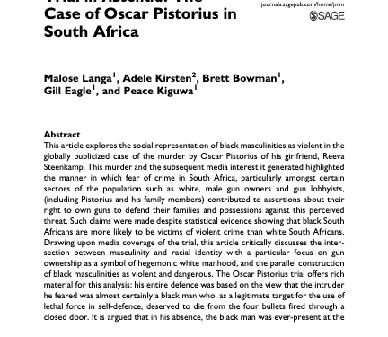 Read MoreThis article explores the social representation of black masculinities as violent in the globally publicized case of the murder by Oscar Pistorius of his girlfriend, Reeva Steenkamp. This murder and the subsequent media interest it ...